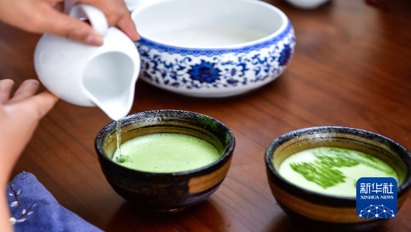 5月14日,在江口县贵茶产业园茶室,茶艺师在制作抹茶茶饮。新华社记者 杨文斌 摄