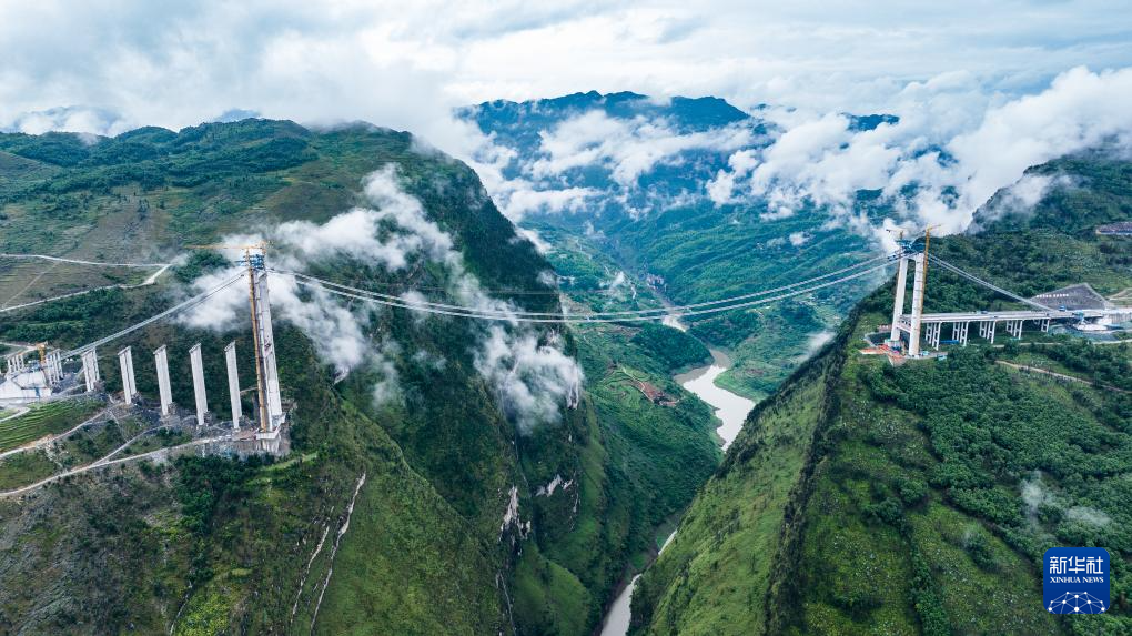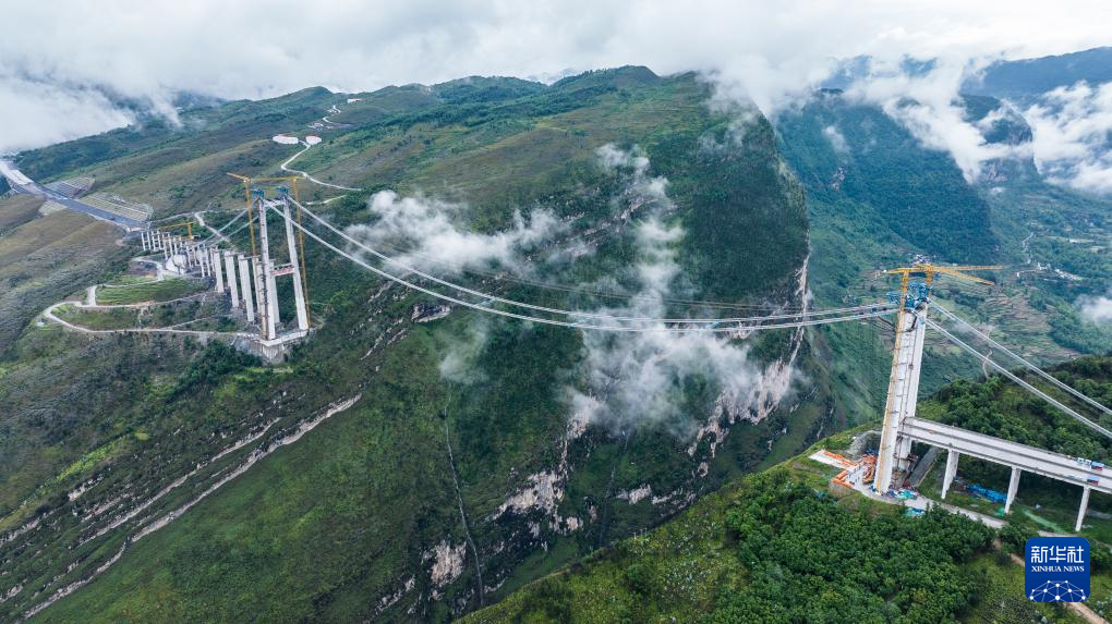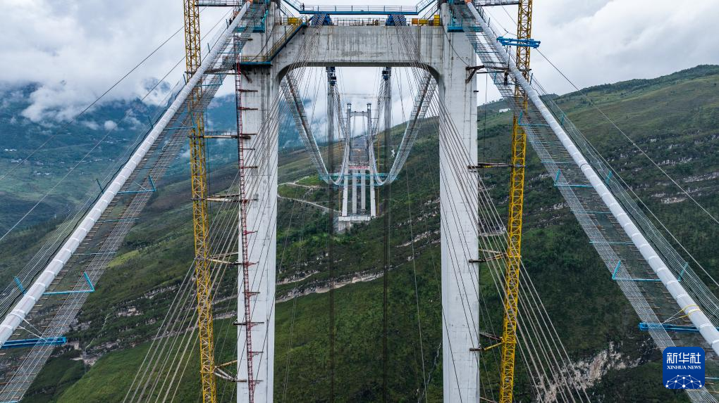 工人在施工猫道上行走,前往作业地点(5月28日摄,无人机照片)。新华社记者 陶亮 摄